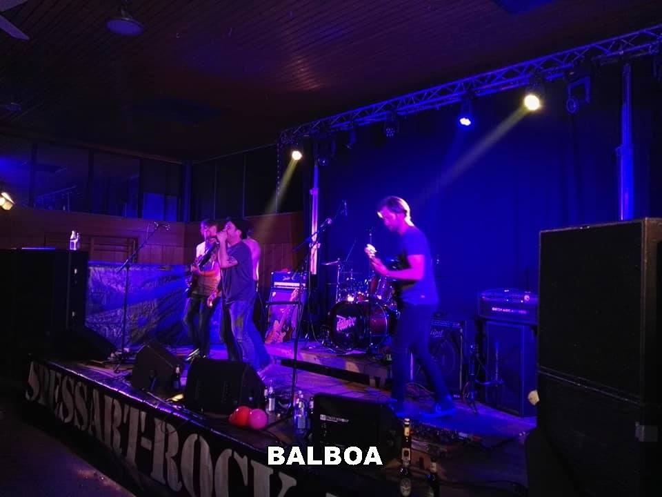 Nachdem die ersten drei Bands des Spessart Rock ihre eigenen Songs präsentierten, sollte mit BALBOA auch eine Cover Band zu Ehren kommen. Dies entspricht voll und ganz dem Credo des Veranstalters. Nun gibt es Cover Bands und es gibt Cover Bands. Balboa spielen nun nicht gerade die Riege der allseits bekannten Gassenhauer des Genres, sondern fahren eher so ein wenig die Underground Schiene. Man sah dem ein oder anderen Besucher durchaus die Verwunderung an, denn auf "Highway To Hell" oder "Master Of Puppets" wartete man vergebens. Dafür pflügten die fünf jungen Rocker das Feld der Alice In Chains oder Creed um. Damit fährt man ein Programm, womit man nicht von Beginn auf der sicheren Seite steht. Doch Balboa verstanden es, den Spaß, den sie selber auf der Bühne augenscheinlich hatten, auf das Publikum zu übertragen. Unbekümmert und als Eyecatcher für die Mädels im Saal auch teilweise Oberkörper frei coverte sich der Fünfer ab halb Zwölf rund 100 Minuten durch ein druckvolles Set mit vielen Überraschungen. Eine gelungene Performance und ein würdiger Abschluß um in Sachen Spessart Rock das Dutzend vollzumachen.